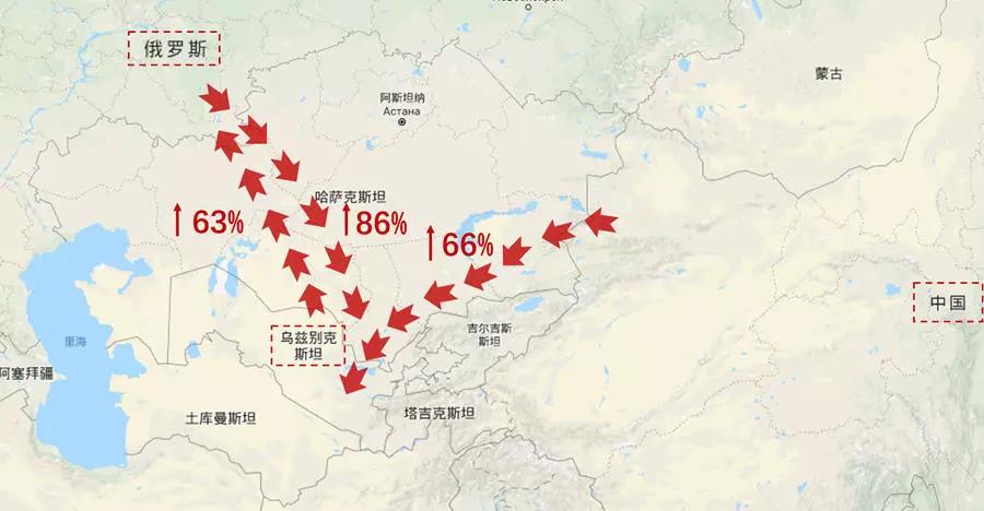 據(jù)介紹,這種大幅增長主要表現(xiàn)在南向與哈薩克斯坦接壤的烏茲別克斯坦的進出境上。中國→烏茲別克斯坦之間的交通運輸量增長了66%,而俄羅斯→烏茲別克斯坦的交通運輸量增長了86%,烏茲別克斯坦→俄羅斯的運輸量增長了63%。(見下圖)